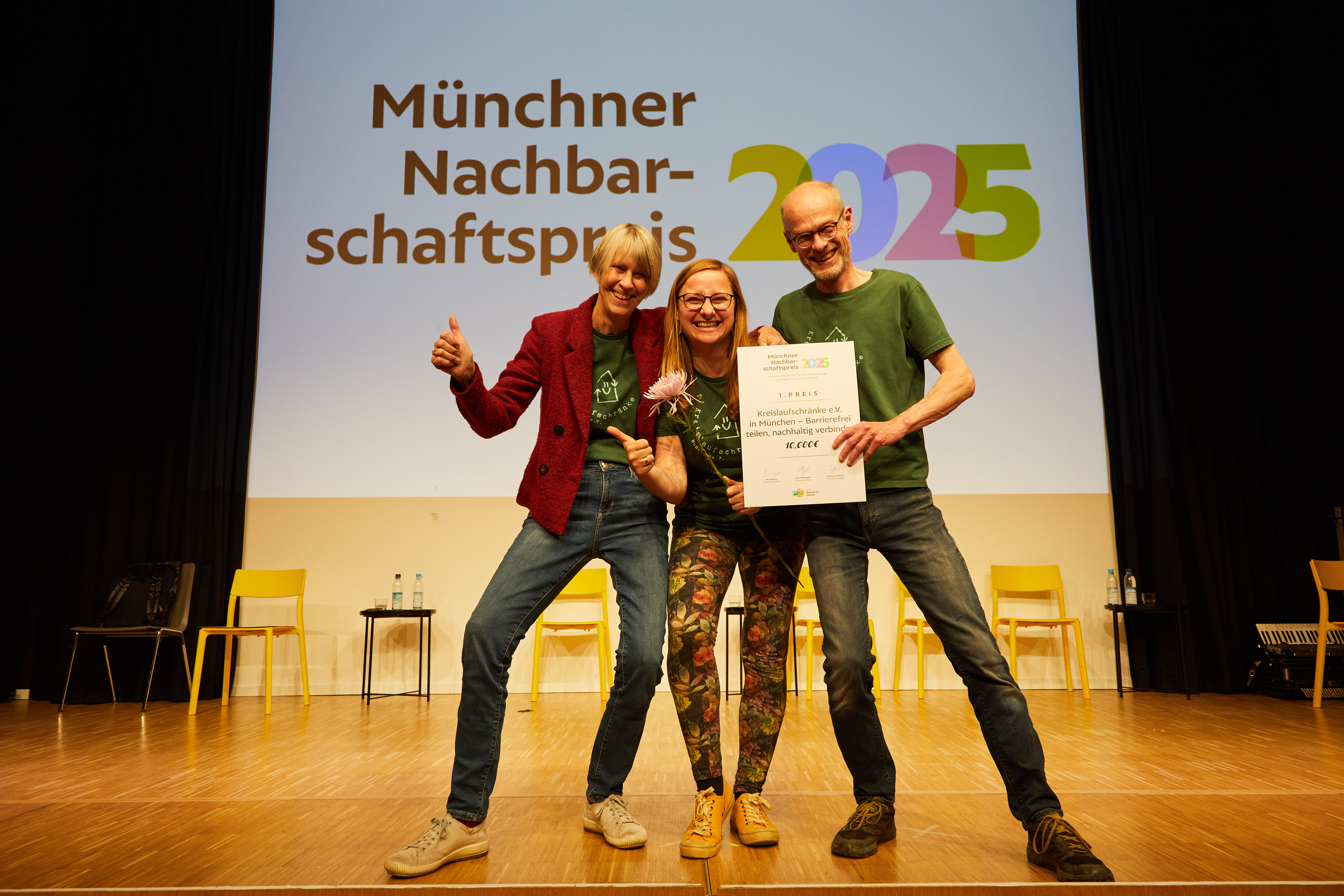 große Freude über den ersten Platz beim Münchner Nachbarschaftspreis: Julia Schnell, Hannah Patalong und Chris Ross (v.l., Foto Jan Scheutzow)