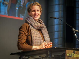 „Wir sind alle Experten für das Wohnen“: Im Rahmen ihres Vortrags über den „Mehrwert der Teilhabe beim Bauen und Wohnen“ unterstrich wagnis-Vorständin Rut Gollan (Foto Till Budde) die wichtige Rolle der Teilhabe in der Architektur. Beim 30. Berliner Gespräch des „Bund Deutscher Architektinnen und Architekten“ (BDA) referierte sie Anfang Dezember im Deutschen Architektur Zentrum in Berlin.