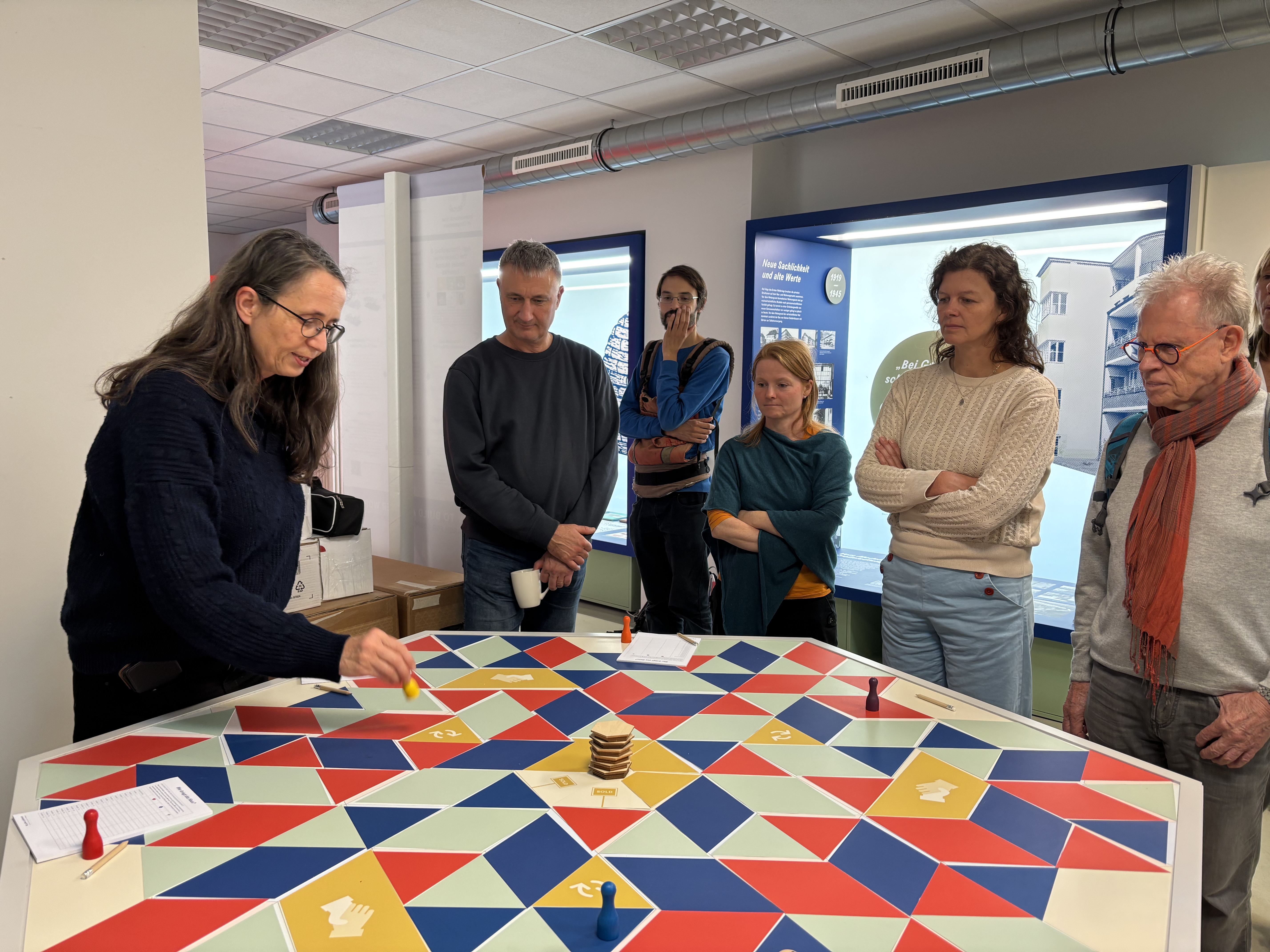 von links: "Wer kriegt das Haus?" heißt das Spiel über einen Kampf mit einem Investor, das Barbara König vom Genossenschaftsforum den Besucher*innen aus München zeigte.