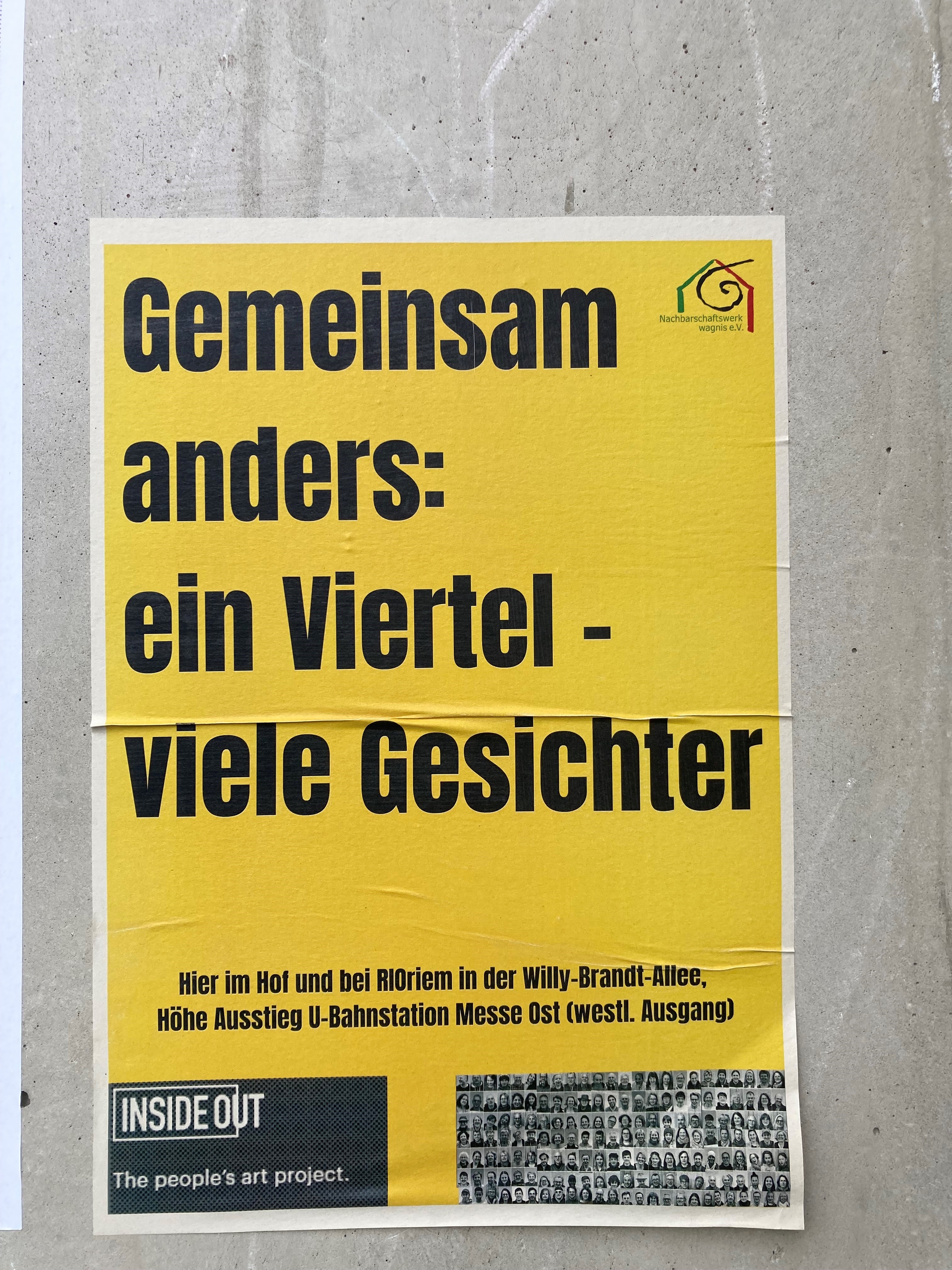Mal lachend, mal ernst, mal nachdenklich, mal fröhlich: Vielfältige Gesichter zeigt die Plakataktion „Gemeinsam anders: ein Viertel – viele Gesichter“, die die Kulturgruppe des Nachbarschaftswerks wagnis e.V. organisiert hat. Vorbild dafür ist das „Inside Out Project“ des französischen Künstlers JR (www.insideoutproject.net).