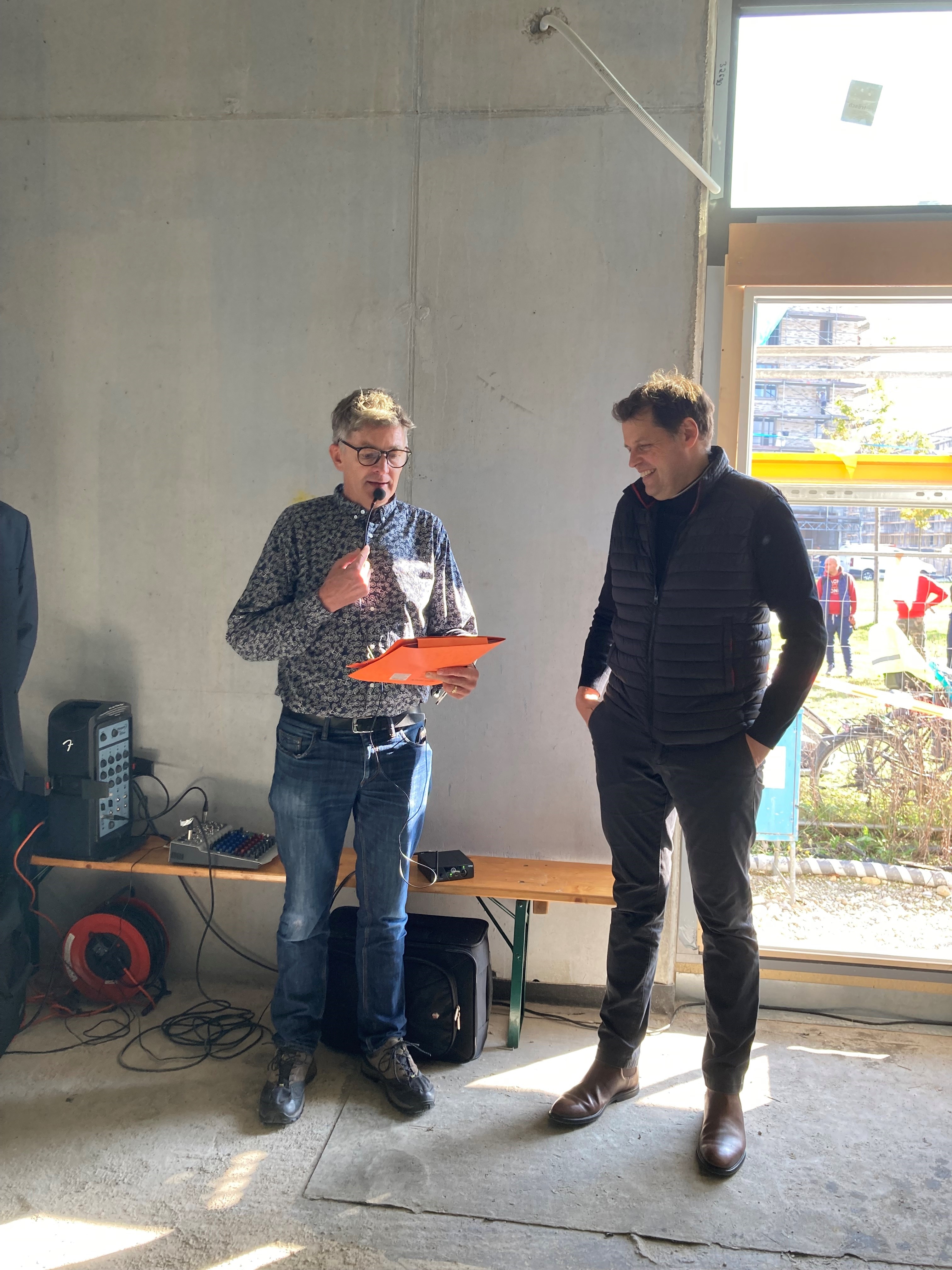 Zum ersten Mal haben sich in München eine traditionsreiche Genossenschaft, nämlich die München-West, und mit wagnis eine junge Genossenschaft zusammengetan, um gemeinsam ein Vorhaben auf den Weg zu bringen. „Wir haben uns bewusst für diese Zusammenarbeit entschieden, da wir als junge Genossenschaft uns über das Projekt einen tieferen Einblick in eine alte Traditionsgenossenschaft mit einer geölten Verwaltung versprochen haben“, sagte wagnis-Vorstand Christoph Miller in seiner Rede (Bild unten: links). „Und es funktioniert. Wir profitieren an vielen Stellen und danken der München-West für das Vertrauen und für die Zusammenarbeit.“ Thomas Schimmel (Bild unten: rechts), Vorstand der München-West, hob hervor, dass beide Genossenschaften das Ziel hätten, für dauerhaftes und sicheres Wohnen zu sorgen. Die Architekten Jan Fischer vom planenden Architektur-Büro AllesWirdGut und Christian Köhler von Köhler Architekten (für die Bauausführung zuständig) bedankten sich bei allen am Bau beteiligten Firmen für das Engagement, das gerade unter den derzeitigen schwierigen Rahmenbedingungen sehr zu schätzen sei. Benedikt Koch von der Baugruppe wagnisWEST freute sich, dass jetzt der Schritt von theoretischen Plenumsdiskussionen in die Praxis erfolge. Bei mehreren Führungen konnten die Gäste einen ersten Blick in eine Wohnung werfen und den Rundblick von der Dachterrasse des Hofhauses genießen.