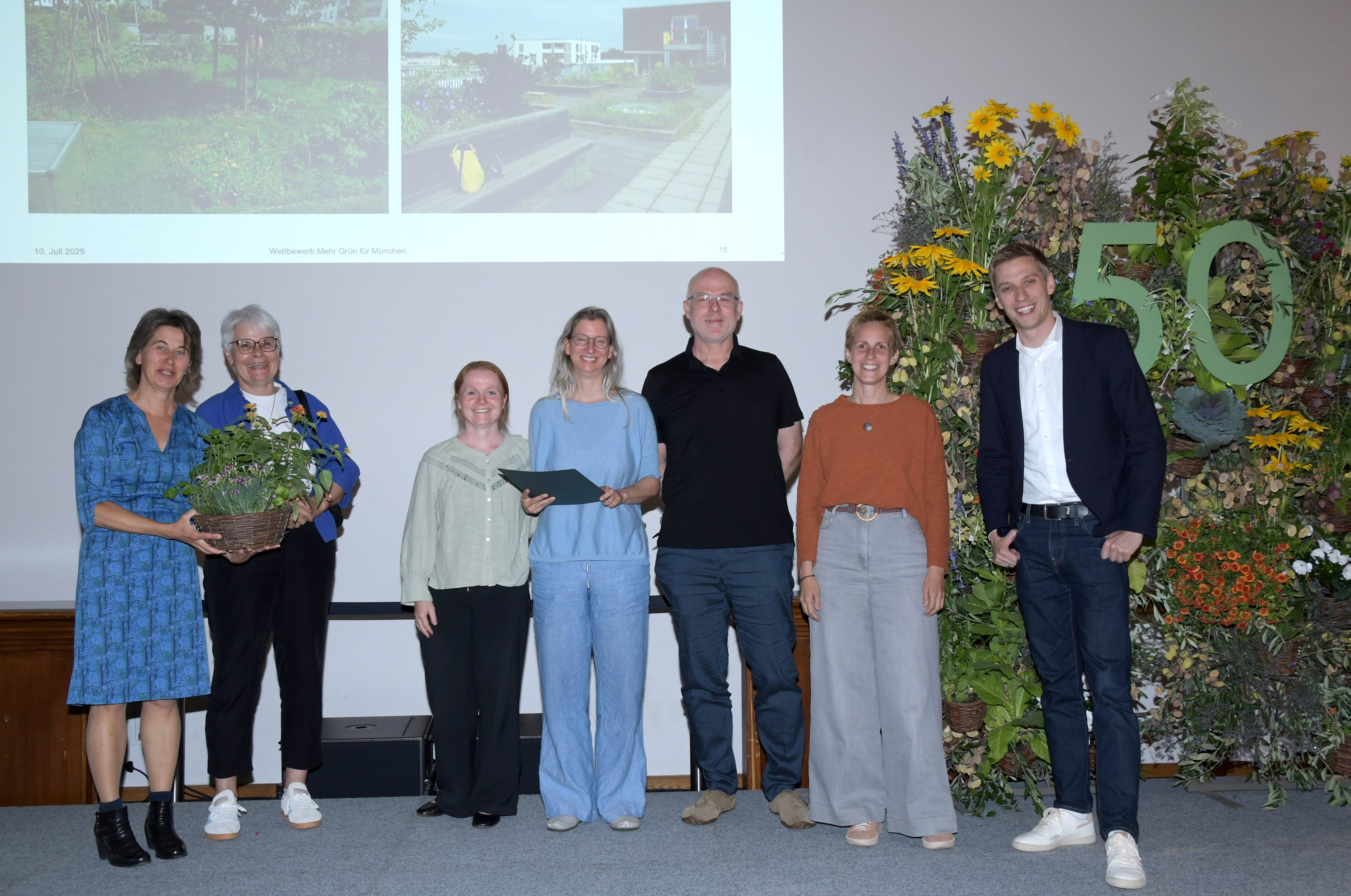 Einer der häufigsten Wünsche, der an ihn als Bürgermeister herangetragen werde, sei die Bitte: Wir wollen mehr Grün in der Stadt haben, sagte Dominik Krause in seiner Ansprache. Die Umsetzung sei nicht immer einfach, deshalb sei das Engagement der Bürger*innen in diesem Bereich sehr wichtig. Vor 50 Jahren habe der damalige Oberbürgermeister Georg Kronawitter „Mehr Grün für München“ gestartet, damit gehöre er den ältesten Wettbewerben in München, so Krause. Sei damals vor allem ein millimetergenau getrimmter Rasen en vogue gewesen, werden heute mehr die Artenvielfalt und Insektenfreundlichkeit gefördert. Christine Kugler unterstrich den großen Nutzen der Begrünung gerade in einer Großstadt mit hohem Versiegelungsgrad. Klimaresilienz werde immer bedeutsamer, jeder Quadratmeter Grün leiste hier einen wichtigen Beitrag. Sie bedankte sich für das bürgerschaftliche Engagement der Teilnehmer*innen: „Sie nehmen hier eine Vorreiterrolle ein und üben Vorbildfunktion aus.“