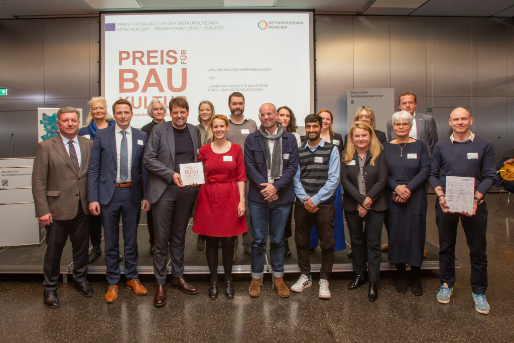Auszeichnung für wagnisWEST: bei der Verleihung des Preises für Baukultur der Metropolregion München 2025 wurde das achte wagnis-Projekt mit einer Anerkennung gewürdigt. Die Jury lobte das Nachhaltigkeitskonzept in der Stadtplanung und in der Architektur.