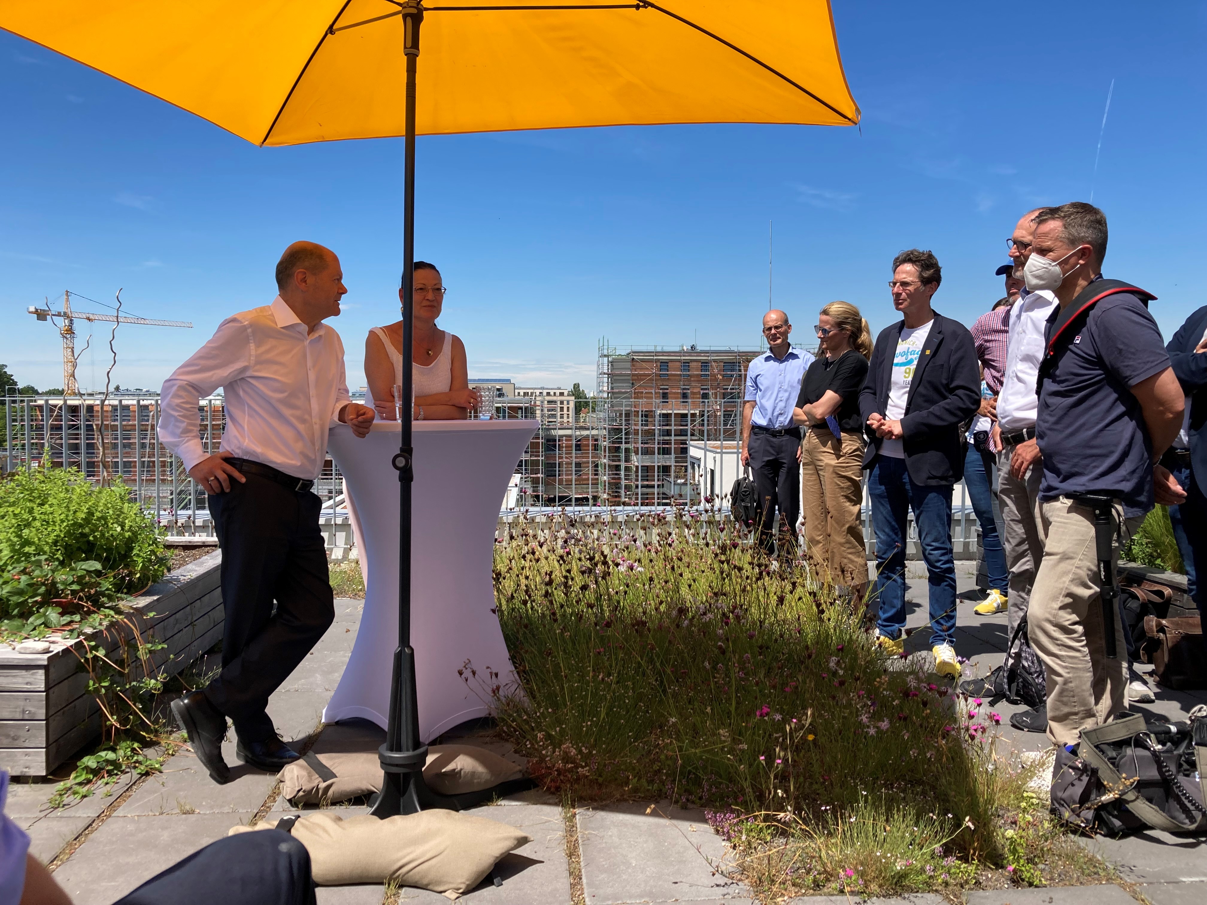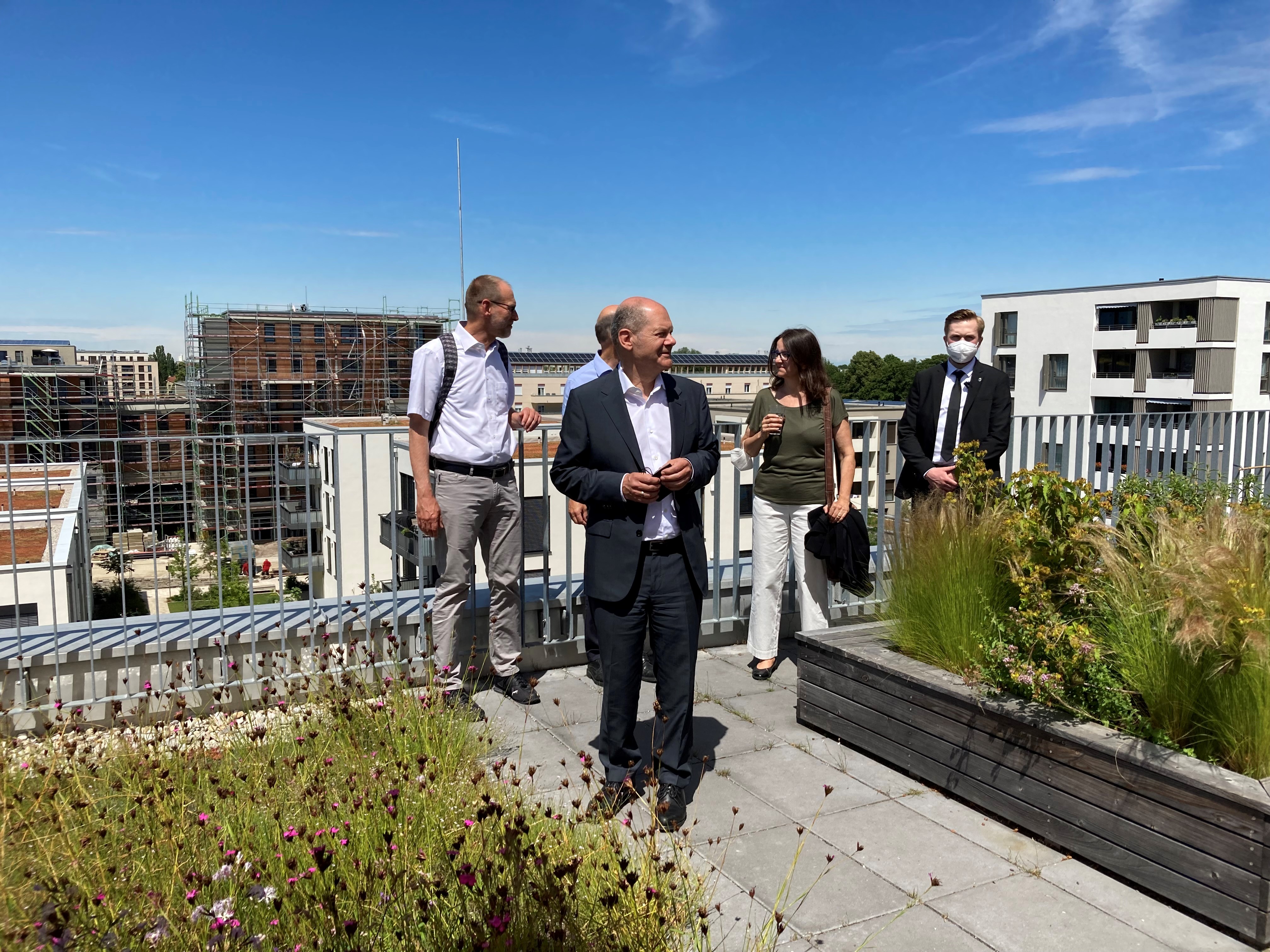 Was Genossenschaften für die Entwicklung von Neubauquartieren tun, darüber machte sich SPD-Kanzlerkandidat Olaf Scholz am Dienstag im Prinz-Eugen-Park ein Bild. Dort besuchte er mehrere genossenschaftliche Wohnanlagen und traf auch VertreterInnen von Münchner Genossenschaften. Beim abschließenden Meeting auf der Dachterrasse von wagnisPARK mit hochsommerlichen Temperaturen betonte der Bundesfinanzminister die wichtige Rolle der Wohnungsbaugenossenschaften, für sicheren Wohnraum gerade in Ballungsräumen zu sorgen.