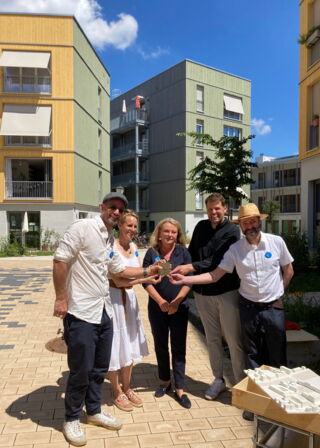 Mit dem Prädikat „KlimaKulturKompetenz“ darf sich künftig unser Projekt wagnisWEST schmücken. Im Rahmen der Architektouren am Sonntag in Freiham überreichte die Präsidentin der Bayerischen Architektenkammer Lydia Haack (Foto, Mitte) eine entsprechende Plakette. Als einziges von 197 Projekten in Bayern erfüllt wagnisWEST alle fünf Anforderungen für diese Auszeichnung, die Jan Fischer vom Büro AlleswirdGut, wagnis-Vorständin Rut Gollan, der Vorstand der Wohnungsgenossenschaft München-West Thomas Schimmel und Christoph Hagenacker vom Landschaftsarchitekturbüro bauchplan (Foto von links) entgegennahmen. Die diesjährigen Architektouren, veranstaltet von der Bayerischen Architektenkammer, standen unter dem Motto „Vielfalt bauen“, „wir wollen damit zeigen, was gutes Planen und Bauen bedeutet“, betonte Lydia Haack. Bei drei Führungen konnten sich am Sonntag Besucher*innen selbst ein Bild davon machen, wie das Planungsteam die Anforderungen für die Auszeichnung Energieeffizienz, Klimaanpassung, Flächensparen, Barrierefreiheit und weitere Aspekte der Nachhaltigkeit in die Praxis umgesetzt hat.