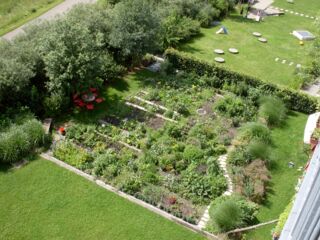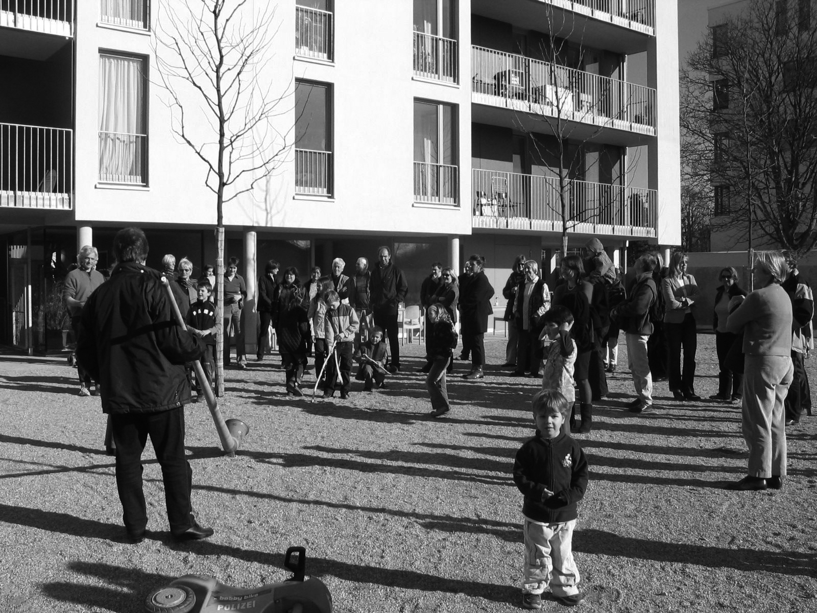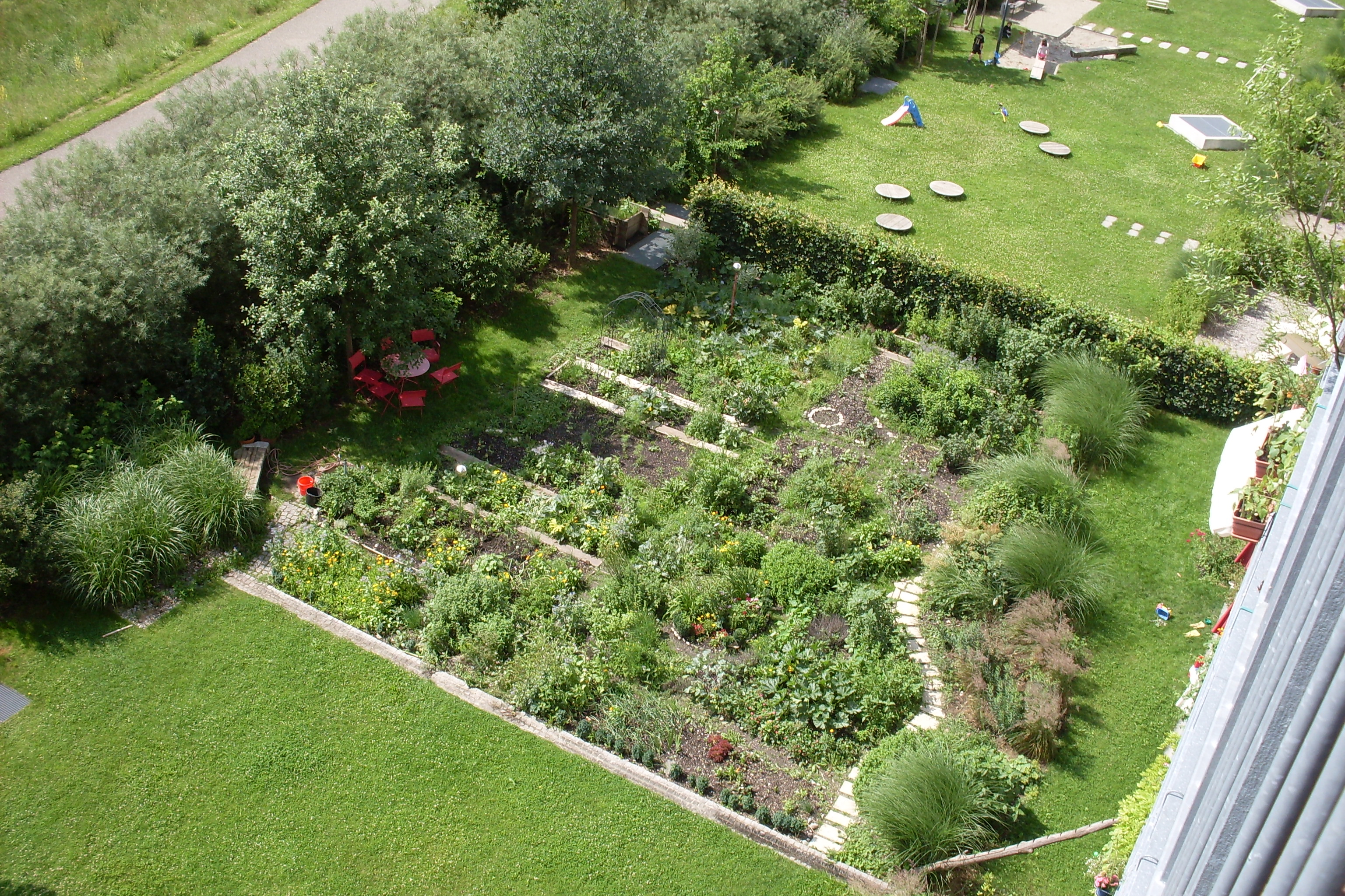 Stolz sind die Bewohner*innen auf den schönen Garten über der Tiefgarage, der mit viel Liebe sehr individuell angelegt wurde und versorgt wird. Der Garten wie auch die außergewöhnlichen Spielgeräte, der Brunnen und alles, was möglich ist, entstanden in Eigenarbeit.