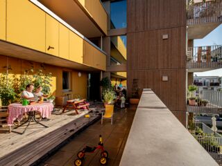 Neben den herkömmlichen Wohnungen und gemeinschaftlichen Angeboten entstanden auch zwei Einheiten mit je 3 Kleinstappartements, die in der Trägerschaft des SkF (Sozialdienst katholischer Frauen) organsiert sind. Dieses mit der Baugruppe abgestimmte Projekt hat zum Ziel, ehemals wohnungslosen Frauen die Möglichkeit für einen neuen Start in der genossenschaftlichen Nachbarschaft zu geben.
