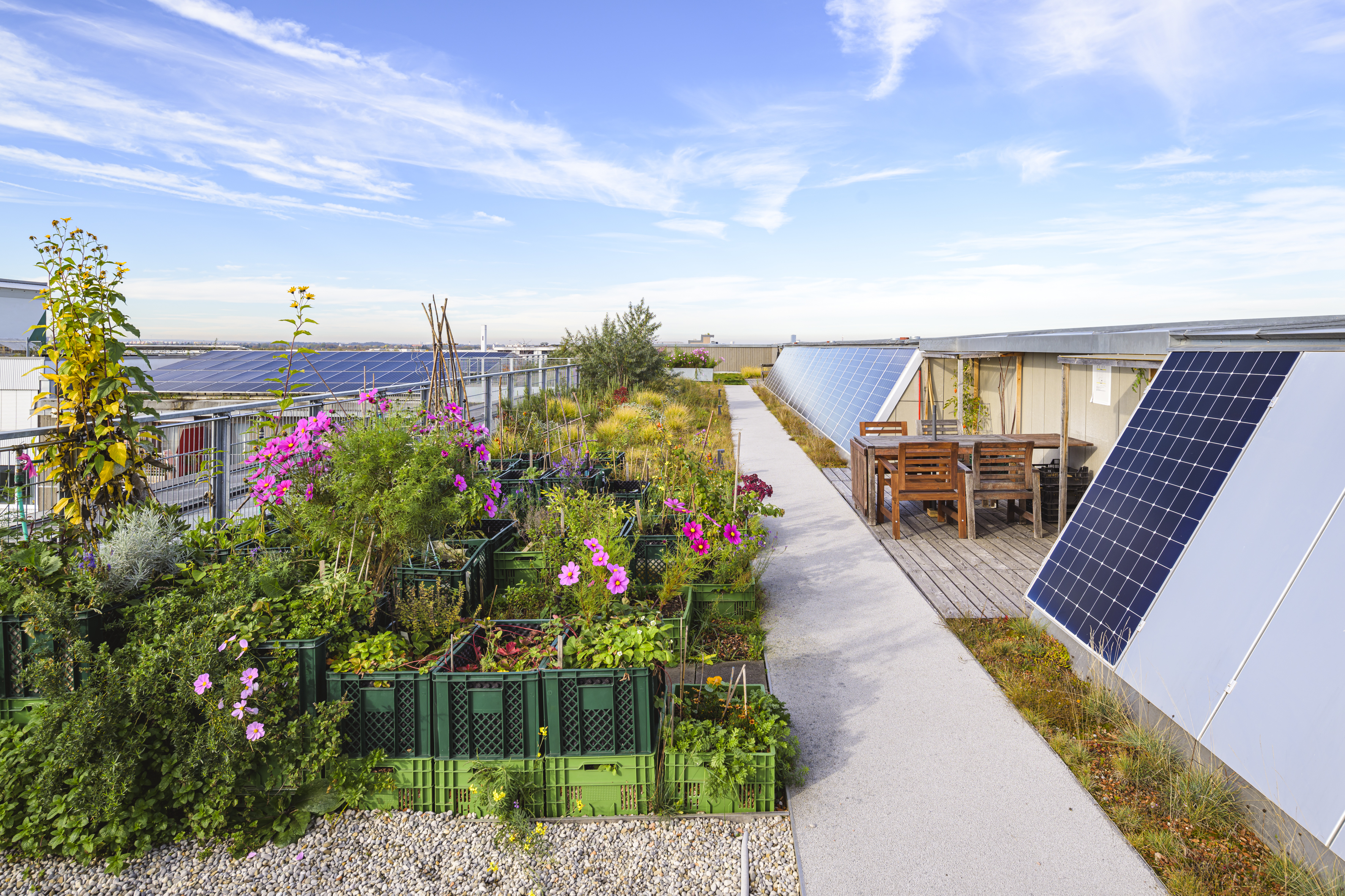 - Gemeinschaftliche Dachterrasse mit Alpenblick, Beeten, Gemeinschaftsraum und Sommerküche