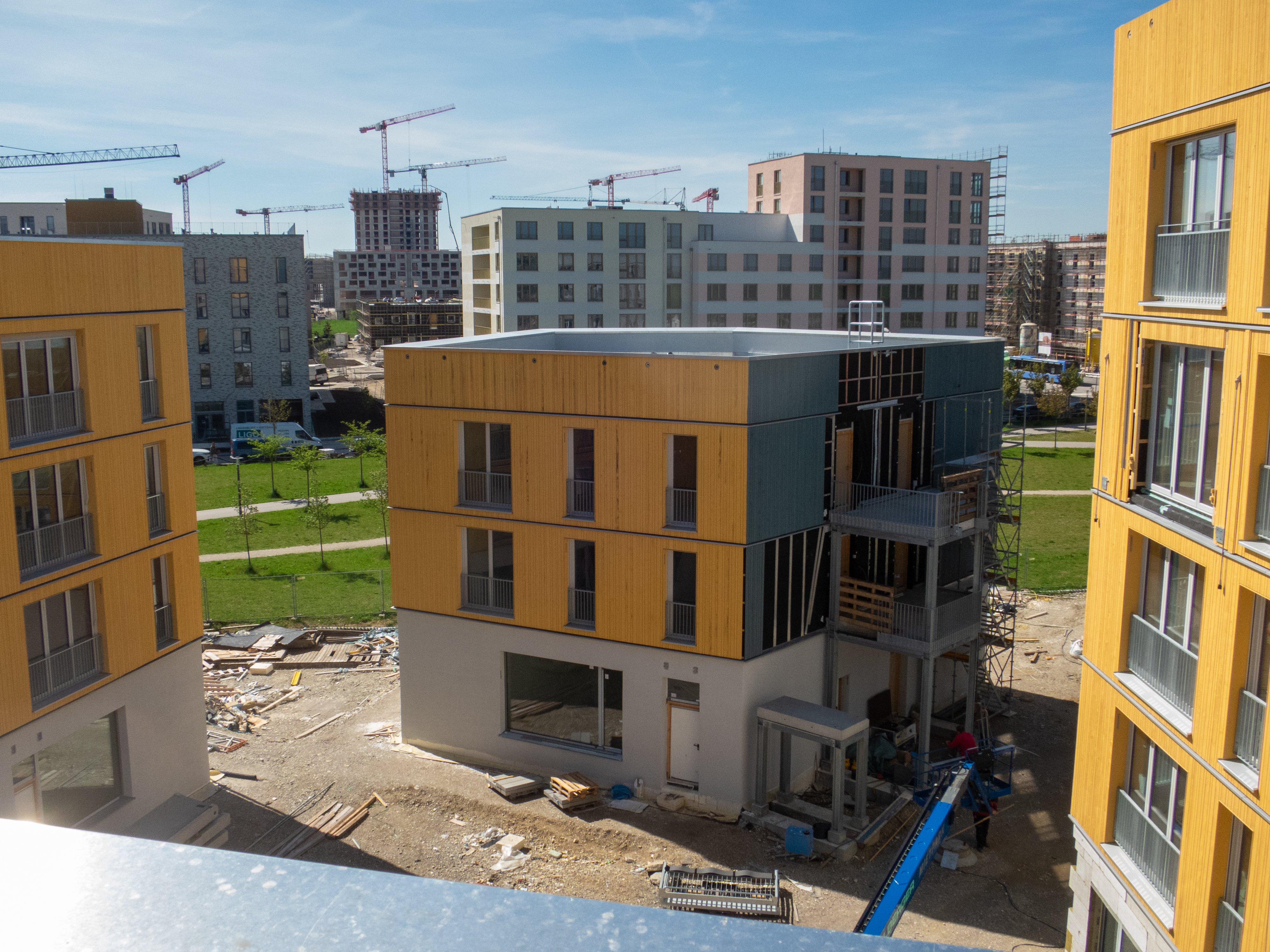 Die Häuser auf dem Grundstück an der Aubinger Allee wurden in Hybridbauweise erstellt, die Höhen variieren von 3 bis 6 Geschossen. Viele Gemeinschaftsflächen wie Werkstatt, Dachgärten, Toberaum und Lesegalerie stellen Platz für Austausch und Begegnung sicher. An die quirlige Erdgeschoss-Zone in der Mikrostadt schließt sich ein großzügiger grüner Innenhof an. Die Gastronomie im Atriumhaus und der Kindertreff im Hofhaus sind Anziehungspunkt für das gesamte Quartier.